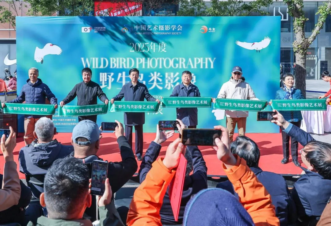 北京国际摄影周组委会副主席兼秘书长杨鸿宝、中国艺术摄影学会副主席王建琪、中国电力摄影家协会主席沈维春、中国老摄影家协会主席潘炳岩、中国华能集团有限公司摄影协会主席马晶、中国生态文化协会会长刘红为2025年度野生鸟类影像艺术展开幕式剪彩。